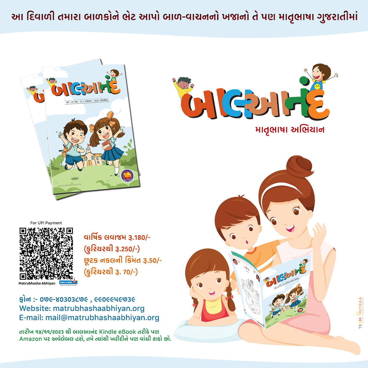 બાલઆનંદનું લવાજમ ભરવા માટે માતૃભાષા અભિયાનનો સપર્ક કરો.